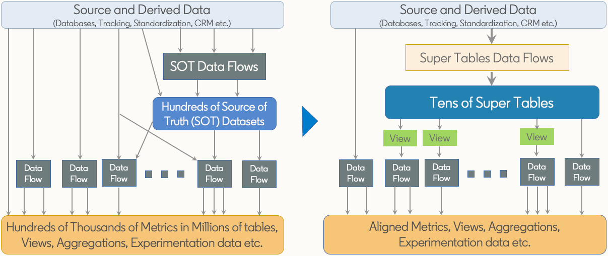 At LinkedIn Super Tables are unit of work like the jobs or the ads_event table. For instance their jobs table consolidate more the 57 sources into 158 columns. Which obvioulsy means a lot, 57 sources into one table is probably more than the average data team use in a whole warehouse. Every ST should enforce SLA to reach 99%+ availability. It then creates datasets everyone in the company can trust and use in downstream data flows.