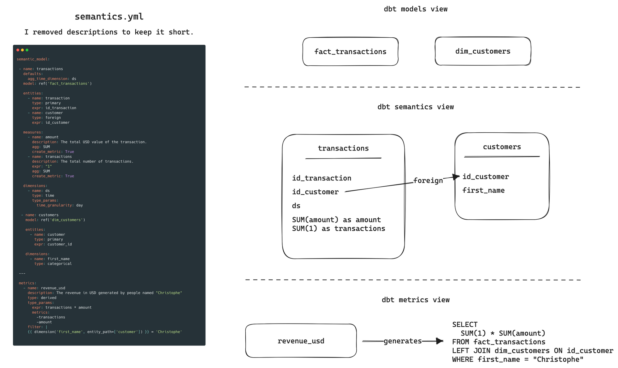 Just ahead I gave you an precise example of how the new nomenclature will behave for a simple case with a fact_transaction model. This is important to notice that the semantic layer is something that sits on top of you current dbt models definitions.