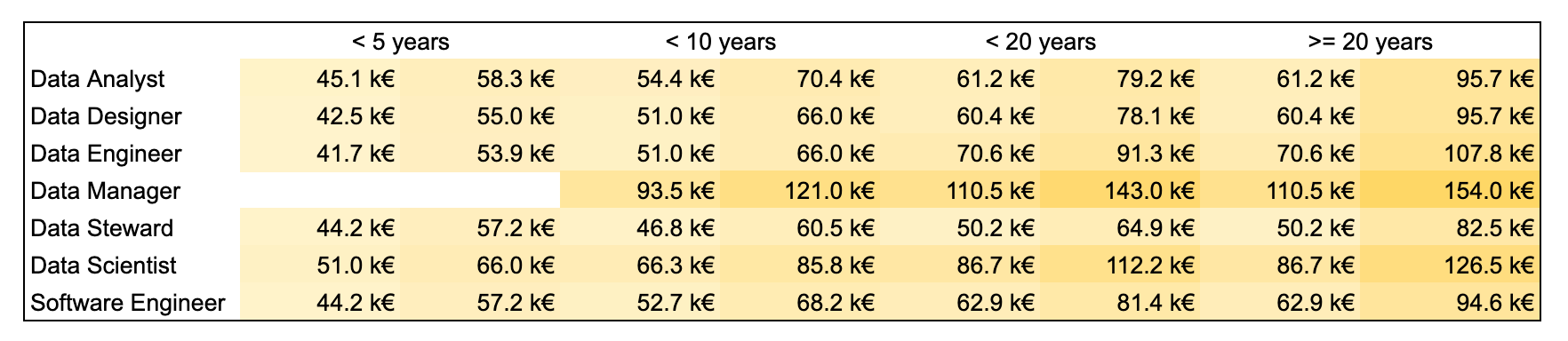 - We have 4 experiences buckets <5, <10, >10 and >20 years. Which is completely relevant for the tech / data field I think, only a few people are +20 years from what I see.
