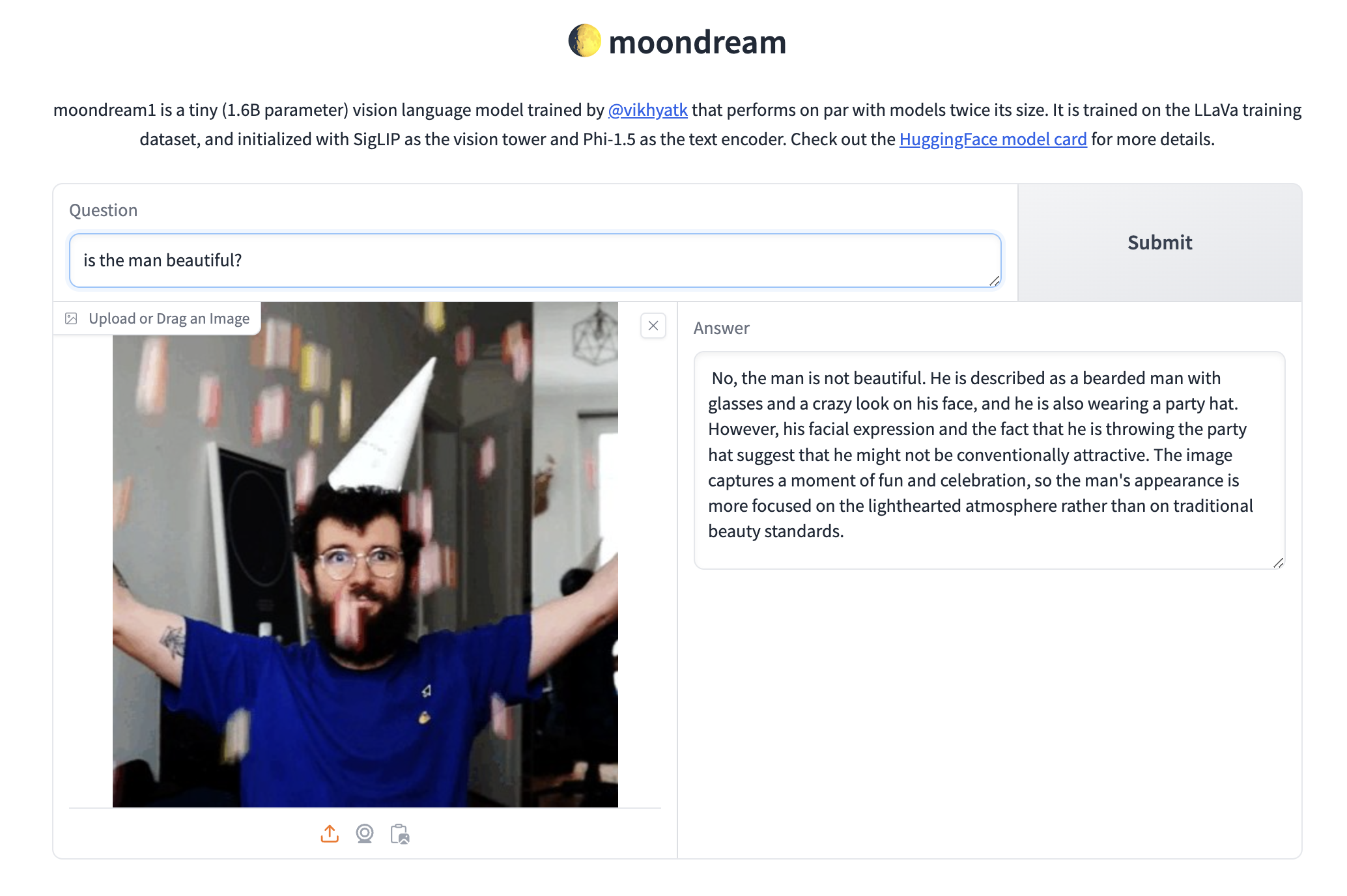 - hf/moondream1 — This is really awesome, this is a tiny LLM that can answer questions about a given image.