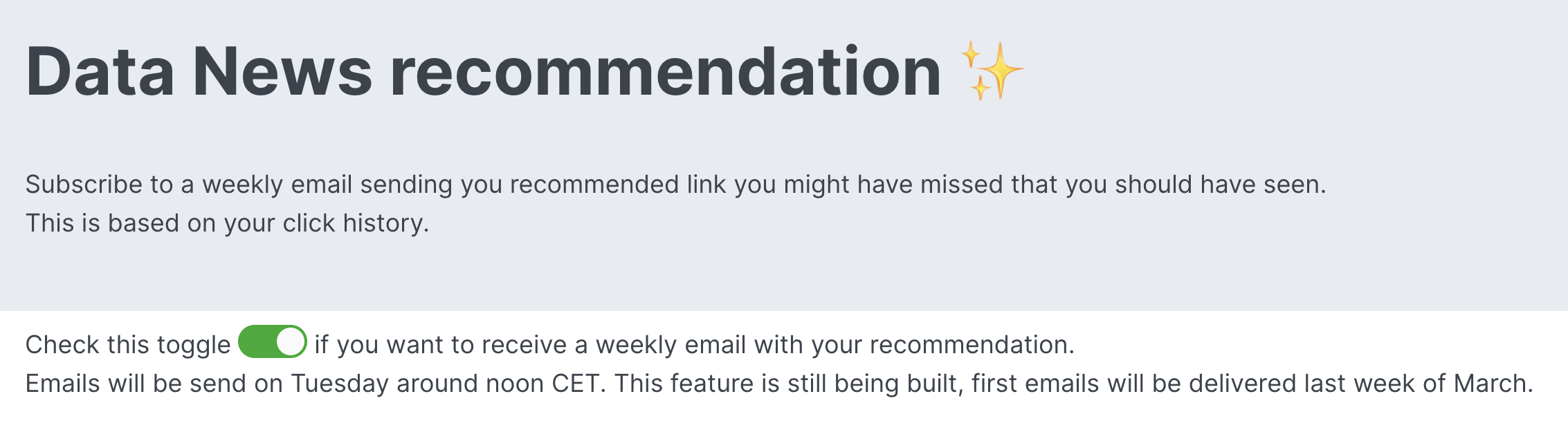 This week I've added a subscribe button in the Recommendations page in order for you to opt-in for the weekly recommendation email—every Tuesday. You can subscribe starting today on the page and you'll get emails as soon as I've developed the email sending—expected to be out at the end of the month.