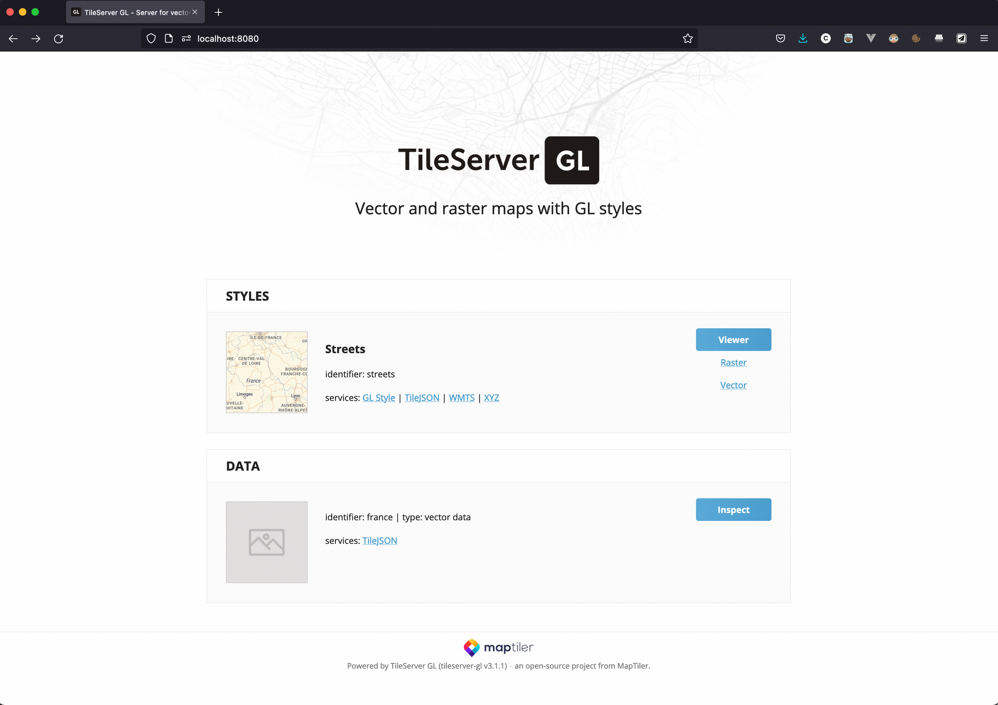 docker run --rm -it -v ${PWD}:/data -p 8080:80 maptiler/tileserver-glNavigate to http://localhost:8080 you will see the screen below. If you click on Streets > Viewer you'll be able to see your map.