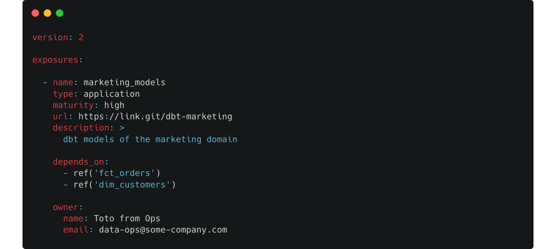 - Every project can define exposures2. Exposures are then a way to define a downstream usage of models in the project. With the exposure nomenclature you can regroup multiple models in the depends_on for an type:application that is supposed to use them. If we imagine some-company, with 2 projects—domains—Ops and Marketing we can have in the Ops exposures the models that we want the outside to be aware of define in it. Then with some kind of automation we can generate sources accordingly in the Marketing project. summarized everything here, to go further GoDataDriven team did an awesome talk at Coalesce explaining how you can achieve this: dbt & data mesh: the perfect pair (?).